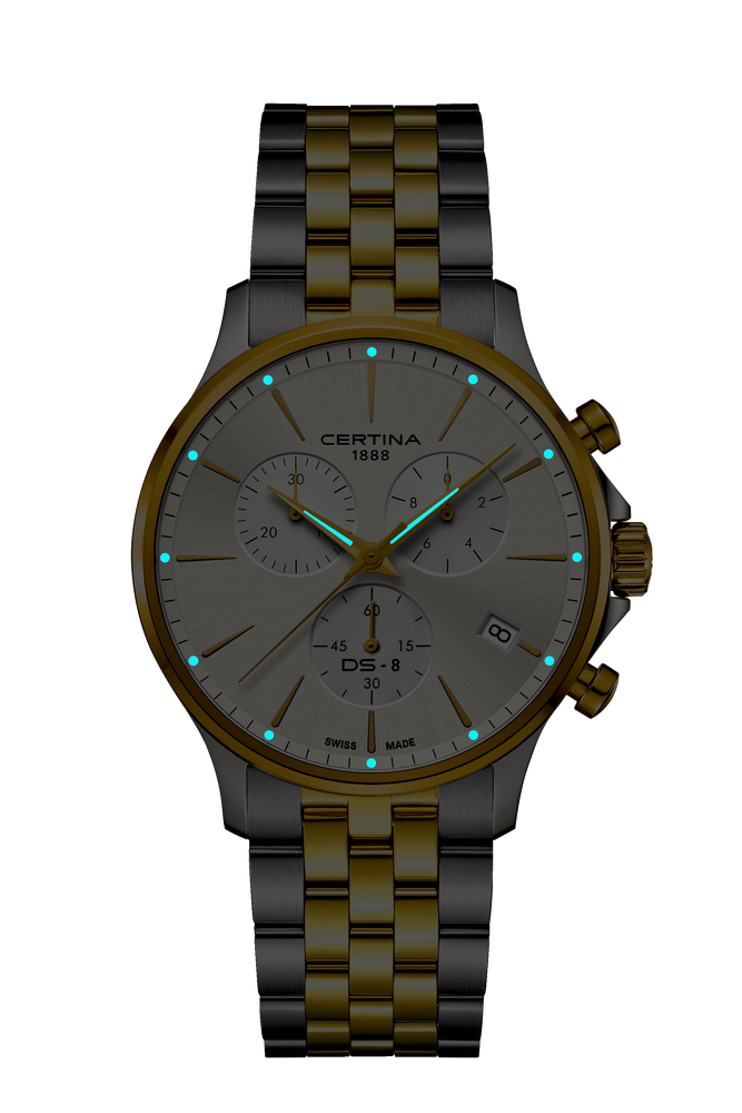 Precision and refinement converge in the Certina DS-8 Chrono, a watch crafted for discerning gentlemen. Powered by a Precidrive™ quartz movement, it ensures remarkable accuracy in everyday use. Its chronograph allows for precise time measurement, while the date window provides a quick and efficient calendar reading. Designed to accompany every moment with distinction, it combines performance with timeless style. Robust and sophisticated, it reflects exceptional watchmaking expertise, ideal for those seeking a reliable and functional timepiece.